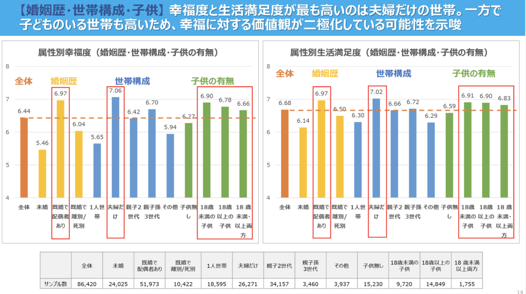 両方の研究を(いいとこ取りで)合わせて考えると、子どもがいる夫婦は子育て中も終了後も、長い目で見ると幸福度が高いと言えそうです。