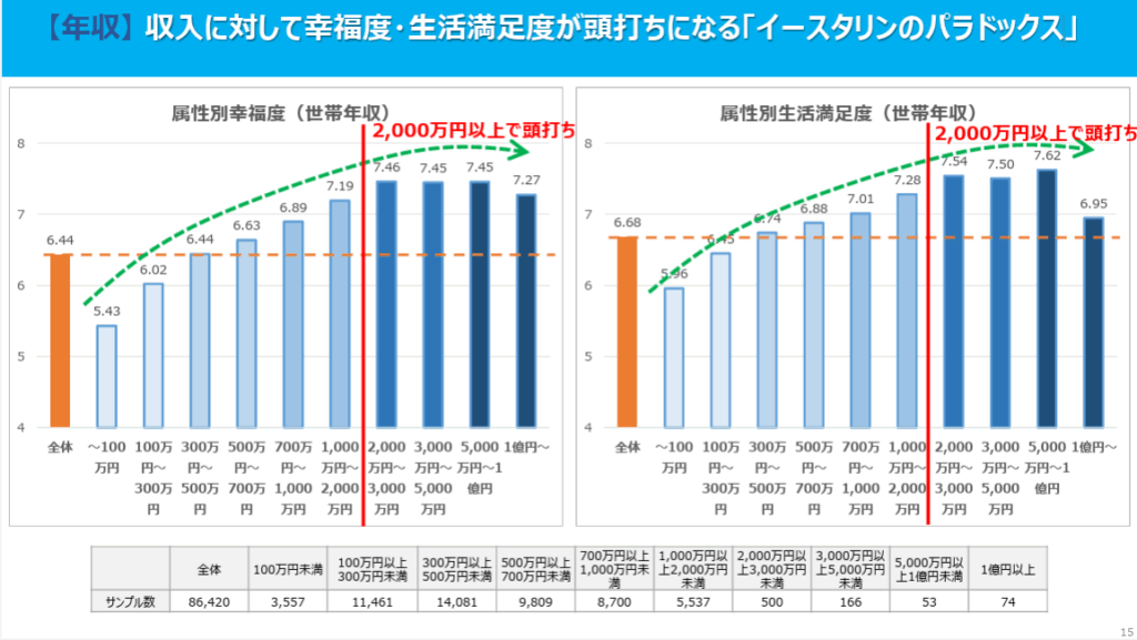 ただ、収入と幸福度の関係は複雑で、単純に年収アップを追いかければいいってわけでもないんです。例えばこんな研究結果があります。