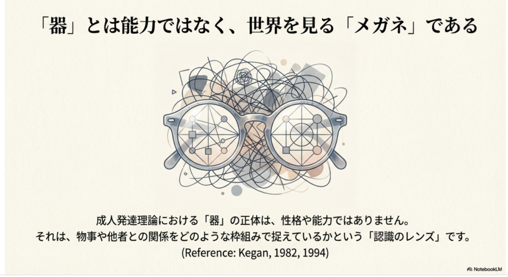 しかし成人発達理論の視点では、器とは性格や能力ではなく、物事や他者との関係をどのような枠組み(メガネ)で捉えているかを指します(Kegan, 1982, 1994)。
