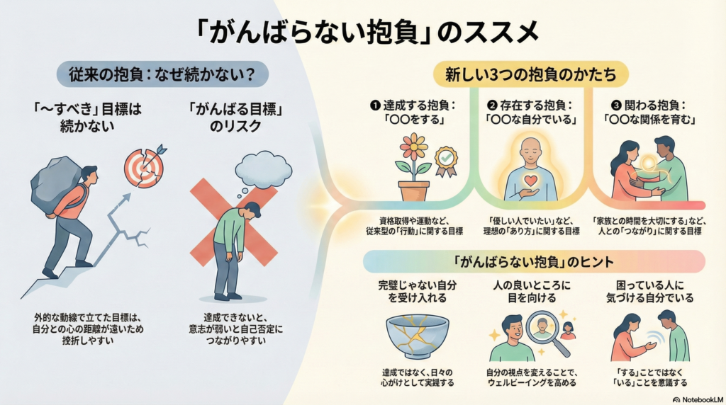 がんばる目標ばかりだと、できなかった時に自己否定につながりやすくなります。一方、「心がけ」のような抱負は、日々の小さな選択の中で実践でき、失敗のダメージも少なくなります。