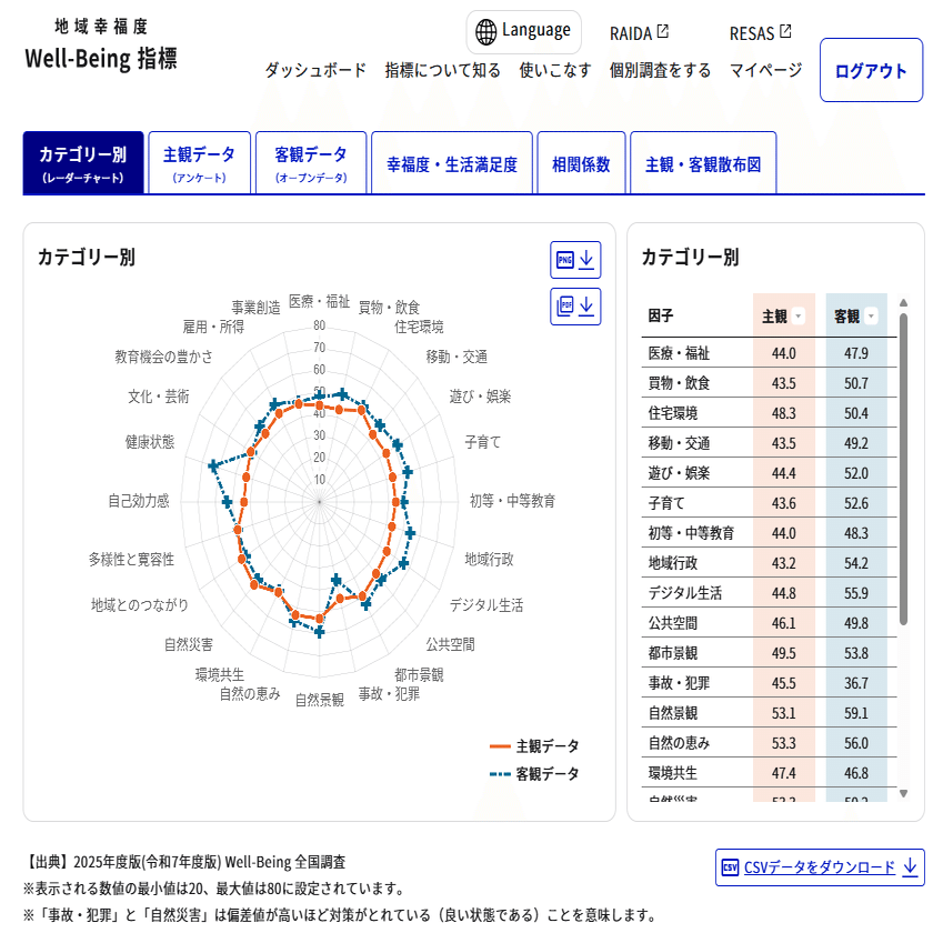 ▼ デジタル庁では、無料で各都道府県市町村のまちの幸福度がわかります!